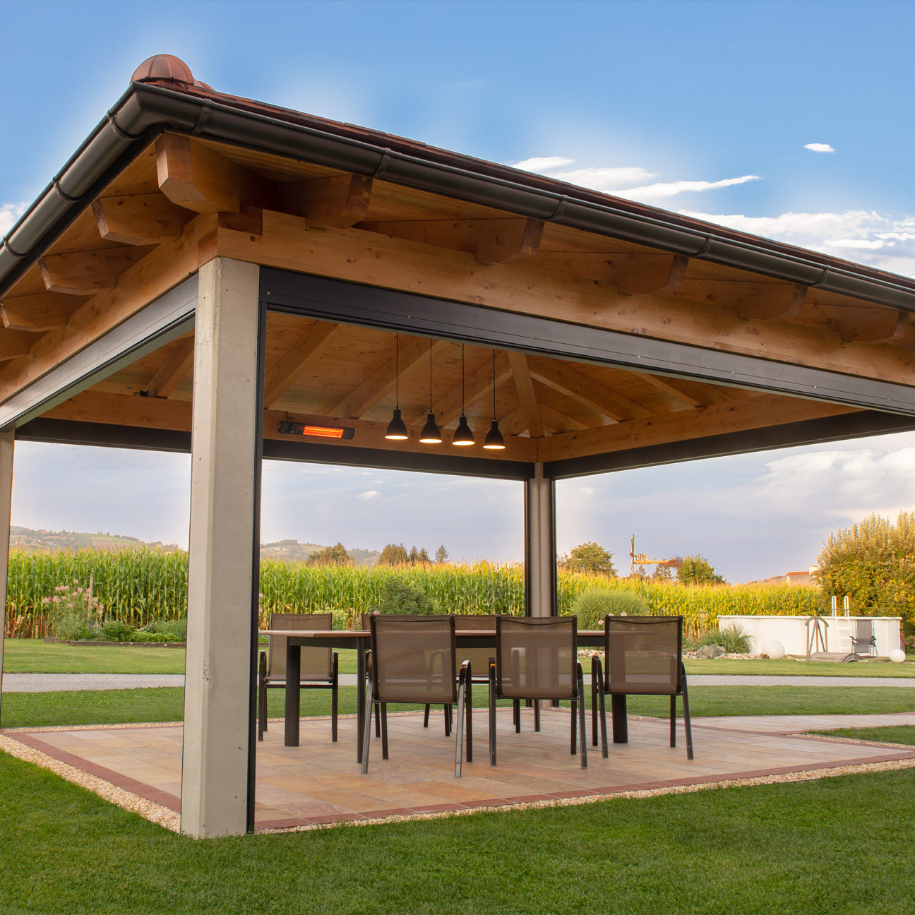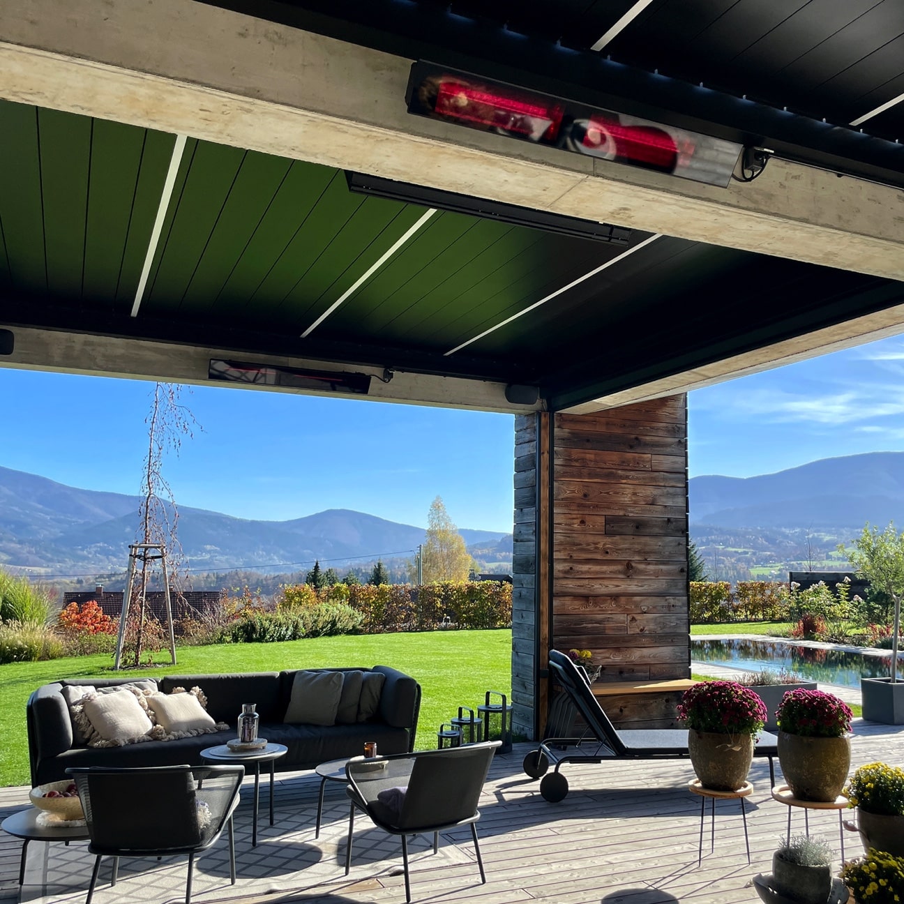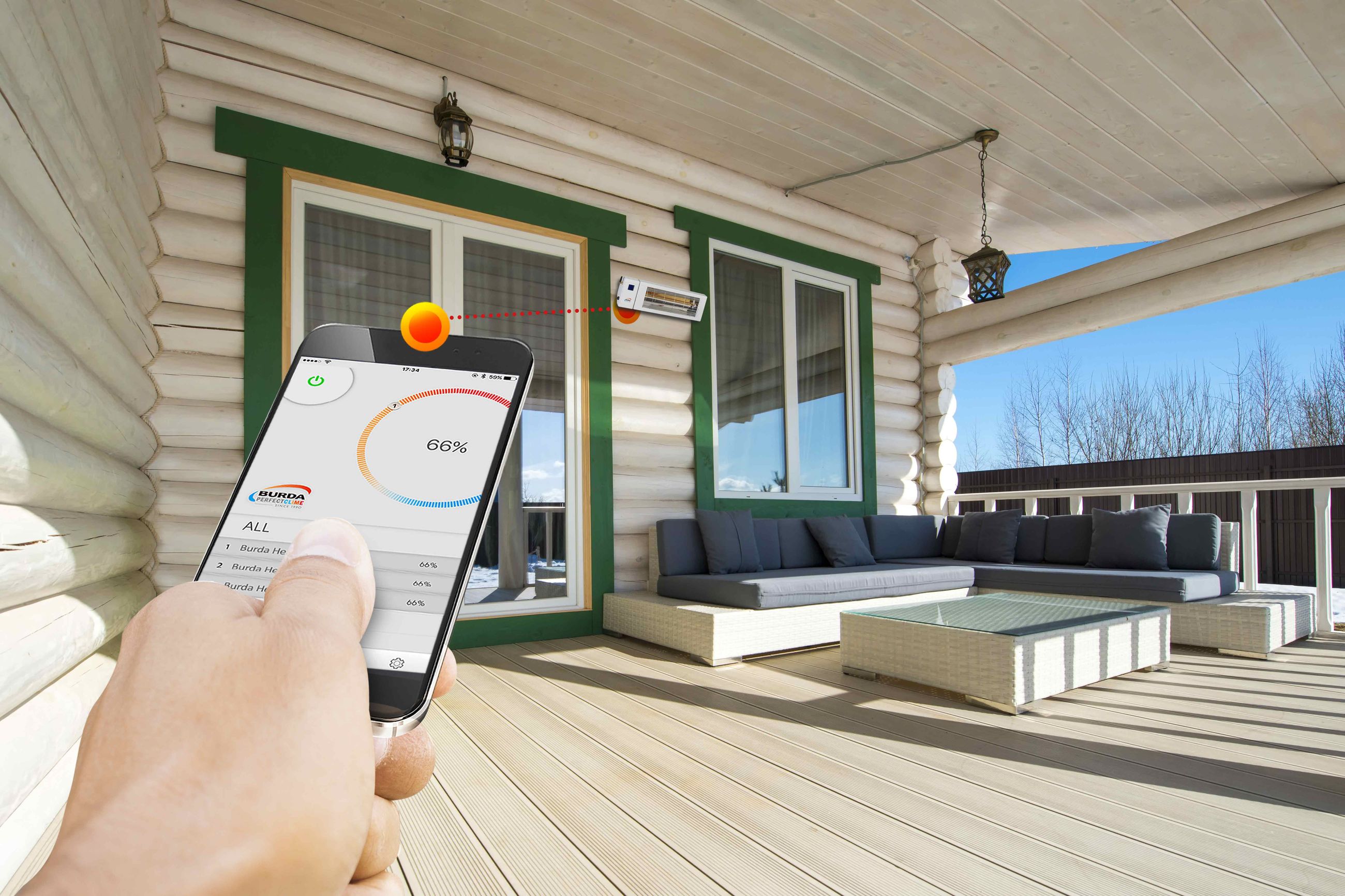 Terrassevarmeren kan styres via app, fjernkontroll eller manuelt.